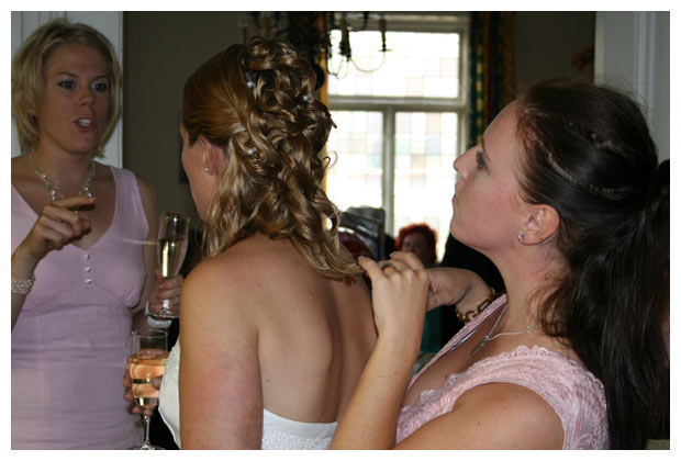 Hovfrisörskan kontrollerar att brudens frisyr har hållt genom både porträttfotografering i stormvindar och vigsel.