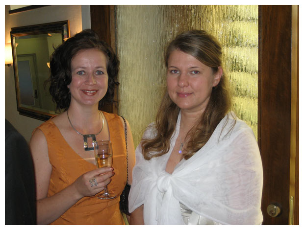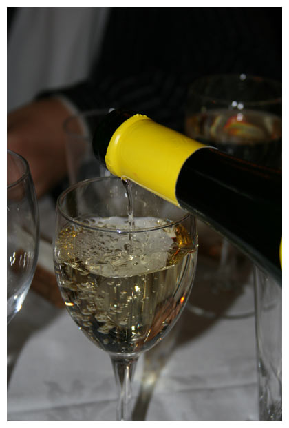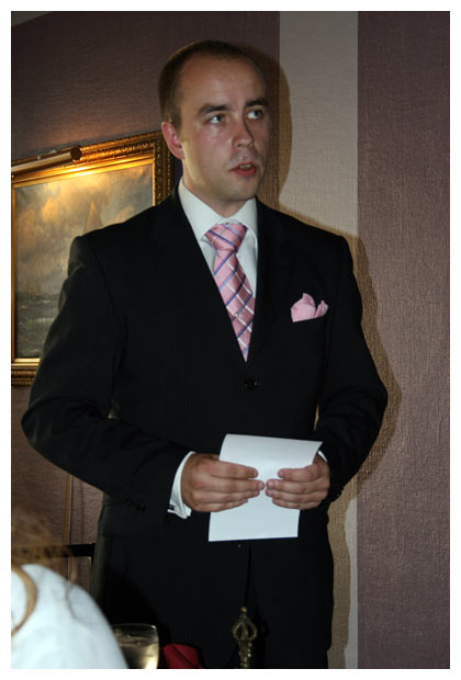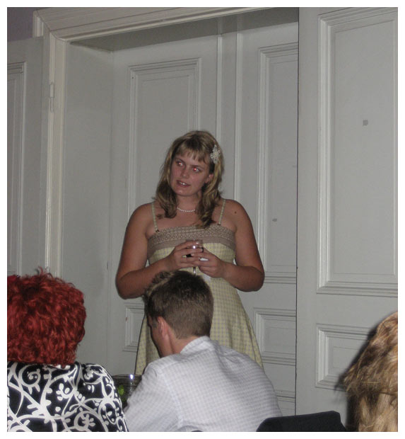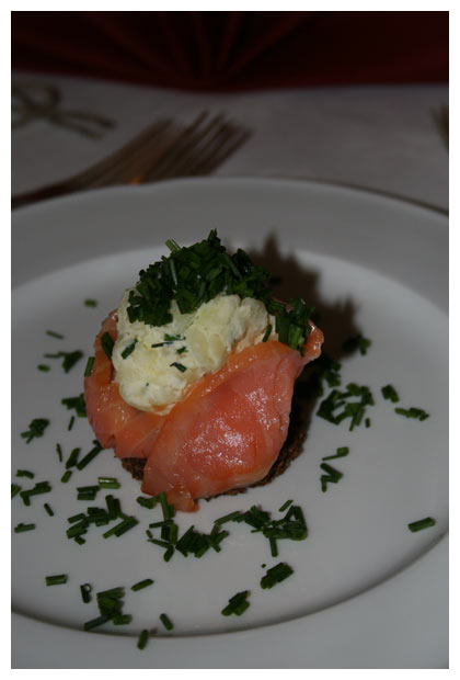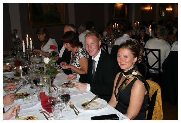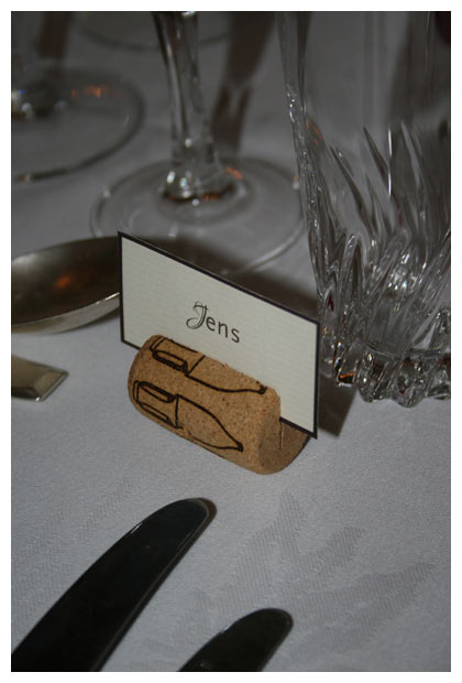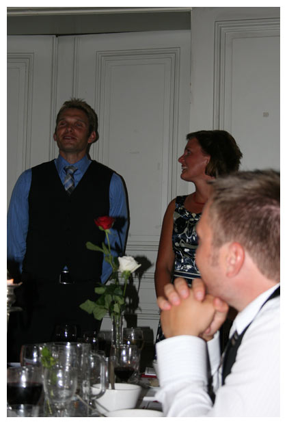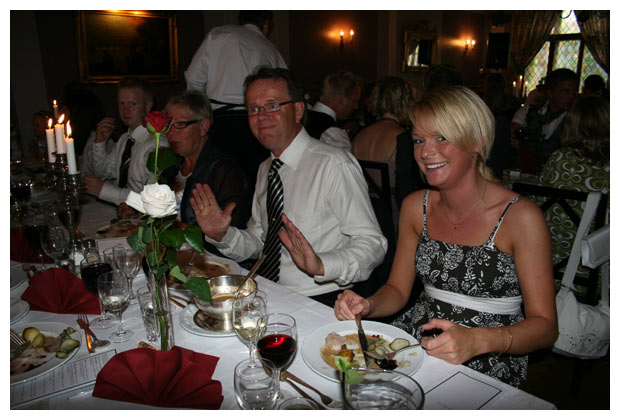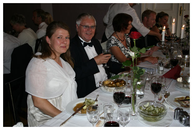 Festhäften och bordsplacering. Vitt vin till förrätten, Bakelse på färskrökt lax med vasabi. Toastmaster in action :-).