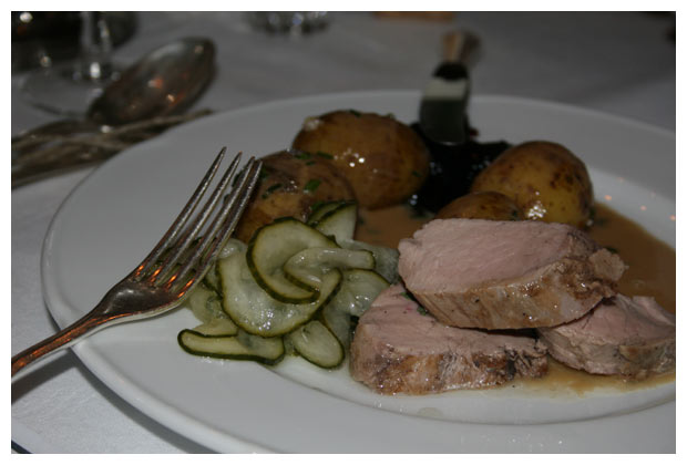 Huvudrätt; Helstekt fläskfilé med råstekt färskpotatis, inlagd gurka och gelé.