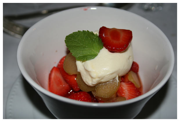 Efterrätt; Vit chokladmousse med jordgubbar och rabarber